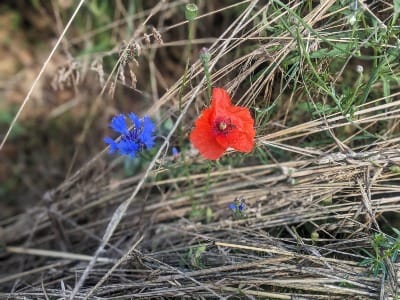Slowly, we made our way up, and after making a left turn, we finished climbing up the hill. We started through a flat straight-away where there were two fields, one on either side of us. The field to our right was made up of wheat, while the field to the left had immature sunflowers planted. There was an overgrown ditch that stretched alongside the road. It was full of little blue flowers along with many orangish-red poppies. The sun actually broke through the clouds. It must have received the memo that we had ‘conquered’ the hill. I look at the wheat. The sun magnified each kernel of wheat as if someone were looking at it under a microscope.