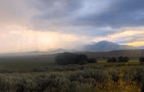 As I continued to peer out the front windshield, it suddenly began to rain. The rain dropped slightly at first, kissing the windshield until suddenly, it was a downpour. I turned the windshield wipers on medium and pressed the brakes to slow down. Driving through Wyoming, the rain came down in spurts. I glanced through the passenger-side window, then the driver-side window, and I was surprised by how green everything was. In my experience, everything was different shades of brown by this time of the year. I peered through the windshield and saw the beginning of another mountain range. It was the following scene that unfolded that simply took my breath away. Travels that I had made up to this point had allowed me to see things, including the Andes Mountains of South America, the Sierra Nevada Mountains of Spain, the snow-capped tips of the French Alps, and the volcanic island hills of Portugal. What unfolded in the following moment simply was the most beautiful thing I had ever seen. The sun was shining down from blue skies onto the mountains. A large rain cloud had formed in front of the mountains. The result was that gold and greens were shown vibrantly from the prairie and the slopes of the mountains.