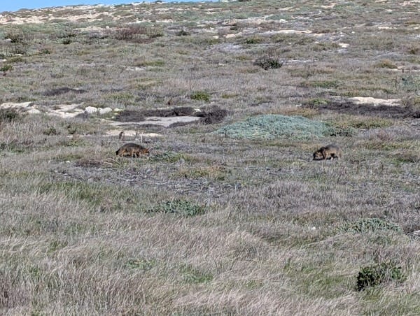 Eventually, we stopped ascending and, after walking a bit, came around a bend. Before us, the island continued. It was easy to tell that we were following along the edge, and thus, looking slightly to the left, one could see the land meeting steep hills that went west as far as the eye could see. We continued, Deb leading the way, and I followed behind. Glancing to the right, movement suddenly caught my eye. Slowing my pace, I looked harder in the direction of where I thought the movement had been. The vegetation reminded me of the high plains desert, with light-colored grass and plants that seemed bleached by the sun's intense rays. Sprinkled in, all that were patches of almost white, as if it were snow that could not melt, but in actuality, was exposed earth. Again, my eyes caught movement, and I looked harder. In an instant, my breathing seemed to stop, and I whispered to Deb to stop. Off the path, roughly twenty yards from us, were two animals the size of large house cats. The coloring of the animals was grey with reddish brown coloring. The tips of their tails were a mixture of tan and blond colors. An incredible feeling of excitement came over me as I realized that I was looking at island foxes. Deb had stopped and began looking in the direction that I was pointing. I was afraid that any quick motions might scare the two foxes. Slowly, I made my way up next to Deb, and we both pulled out our phones to attempt taking pictures. The two foxes continued to search the ground around them, acting as if they were completely oblivious of the two of us having encroached on their space. It was incredible, as I had not seen many wild foxes in nature, and now to be so close. There we stood for a good ten or fifteen minutes, watching the two animals as they searched for food. After the time had slipped away, we slowly began to walk, attempting not to make too much noise as we moved on. I could feel a smile stretching the length of my face; it was simply unbelievable. As we began walking again, we spoke in quiet voices about how we could not believe we had just seen the two foxes.