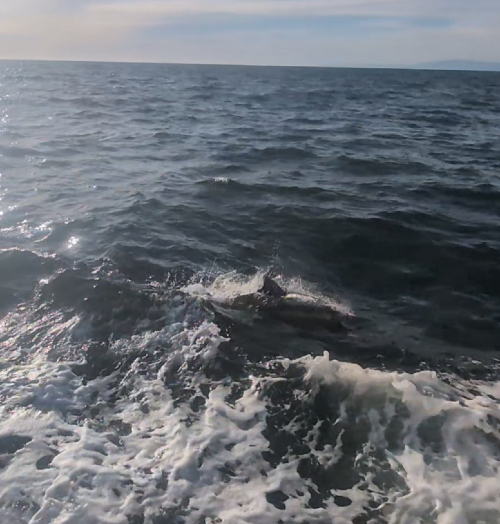 The ferry arrived shortly after five and began the loading process. We were one of the last people to board the boat. First, we climbed the stairs up to see if there was room. After not finding anything, we made our way back down and continued to search for two seats. Having walked inside, we eventually found two spots at the back left corner of the boat, on the outside. With a long blow of the horn, the engines of the ferry revved up, and the boat pulled out. Sitting in the corner of the craft, the waves began to lull us into a trance. Occasionally, mist from one of the waves would hit me, bringing me back from the reminiscing of what I had seen that day. A chill went through me as the spring ocean wind touched my sweaty body. 'Do you want a hot chocolate?' I asked Deb, looking over at her. 'No, I am fine,' she responded. It did seem like a complete oxymoron to think of hot chocolate after all our hiking. I stood up and went inside, approaching the counter where they were selling food and drinks. After ordering a hot chocolate, I made my way back. Just as I reached where Deb was sitting, I glanced into the water, and something caught my eye, then something else. At that moment, a voice came over the loudspeakers, as the boat slowed down, announcing that a pod of dolphins had surrounded our boat. Though we had found the last two seats, we had the best ones. Deb stood up and leaned against me as I pointed out one of the areas next to the boat where they were swimming. Suddenly, two more dolphins rose out of the water. Glancing behind the craft, I saw them rising from the water in an untimed rhythm. Could the day get any better? I thought to myself. Words escaped me on how I could even describe the moment. In that scene, I stood mesmerized, frozen in place. The chill that I had been acutely aware of was suddenly a distant feeling. The moment was simply another instance of nature completely captivating me. The dolphins glided through the water with a natural ease. Just as fast as the mammals had appeared, they began to disappear. The craft sped up, and we were back on our way.