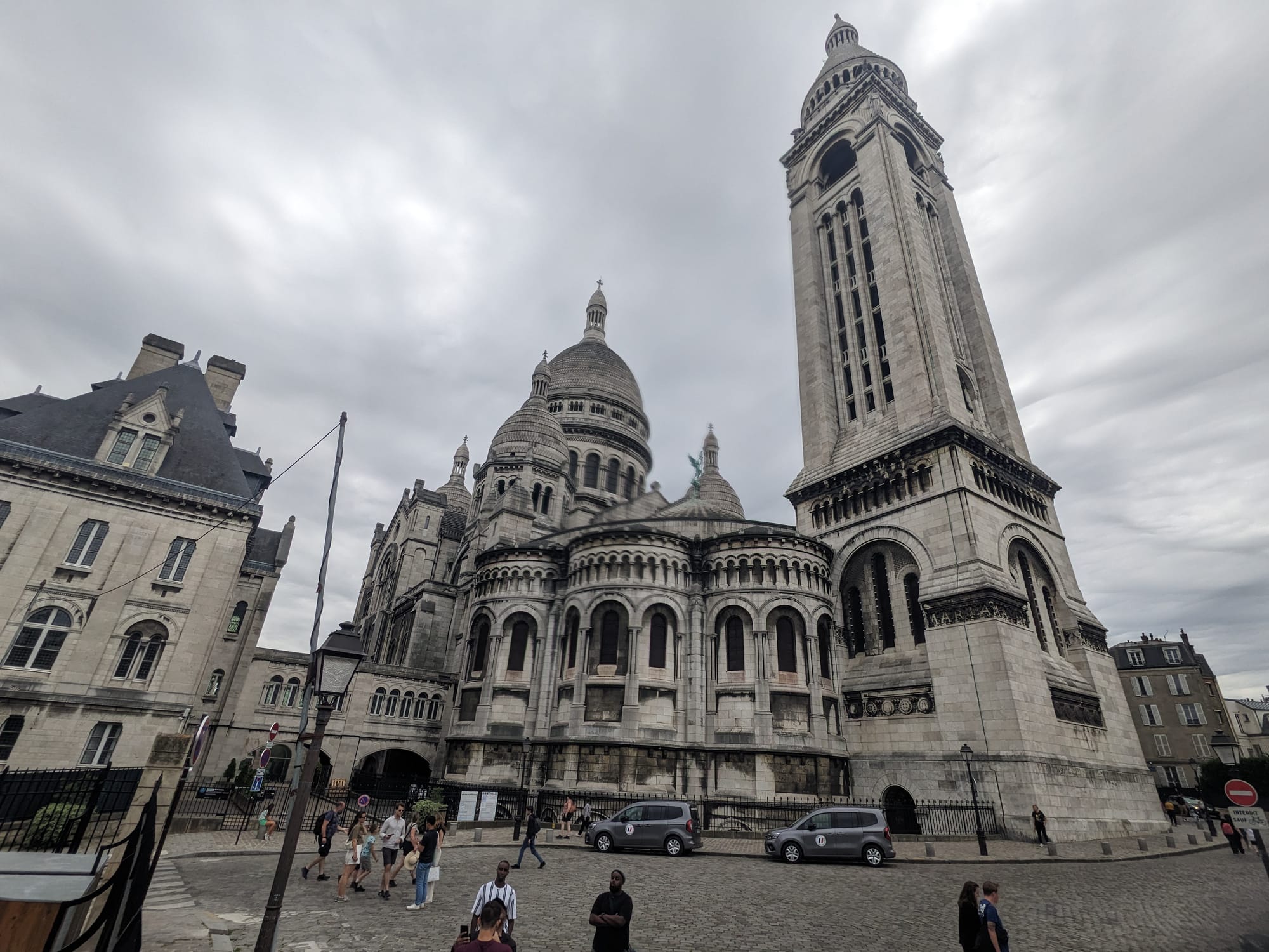 We made our way up one of the narrow streets, lined with fruit, cheese, and of course macarons, and eventually came to a long narrow stairway. At the top of the stairs, we were met with another road and many, many people. In the front of the basilica, there were multiple sets of stairs that led up to the front doors. On each step, a row of people perched. I chuckled to myself, as it reminded me of rows of pigeons. Of course, we joined the flock. A young man stood halfway up the stairs chirping out songs. I thought to myself, is this Howie Day? As time passed, we walked around the structure and then began making our way back down the hill, going a different direction than what we had come.