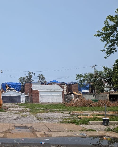 Tom and I jumped into one of the Red Cross vehicles and headed to the Subway. As he drove, I gave directions for the route we were taking. I directed him to drive through a park called Fairground Park. Driving through, we could see huge cottonwood trees that had been blown over. Leaves and branches were scattered about as one would see after a heavy storm. We then turned right onto Natural Bridge Ave and began driving northwest. You could tell, looking at the buildings and homes, that we were starting to see the edge of the tornado's path. Aside from the trees that are most often the collateral damage, I began to see homes that had been affected by the power of the wind. Where roofs had been, giant tarps were placed, attempting to keep out rain and other things.